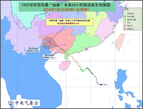 台风“灿都”于22日19时在广东省西部廉江境内减弱为强热带风暴,20时其中心进入广西博白境内,随后减弱为热带风暴。23日5时热带风暴“灿都”的中心位于广西南宁市境内,就是北纬22.9度,东经108.5度,最大风力有8级(18米/秒),中心最低气压为996百帕。