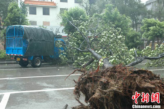 在南海两次“实施”90度急转弯的今年第3号台风“灿都”,7月22日13时45分在粤西湛江吴川市吴阳镇沿海地区登陆,中心最大风速每秒35米,最大风力12级。台风带来的极强破坏力,吴川附近地区茂名市等亦受影响,当地曾一度停水停电。台风将市区路边的树木被连根拔掉。中新社发