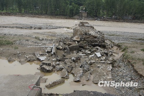 7月23日晚8时至24日21时,河南省洛阳市南部山区栾川县遭遇特大暴雨袭击,7月24日下午5时20分潭头镇汤营村伊河汤营大桥整体垮塌,桥上众多滞留人员不幸落入水中。 中新社发 巩卫东 摄