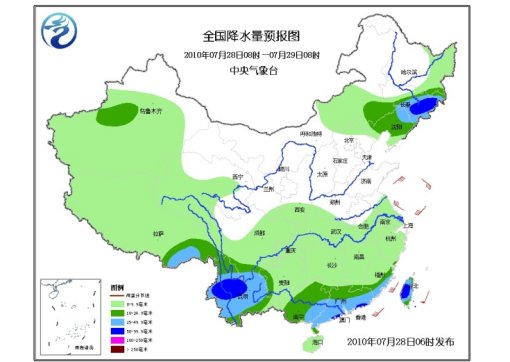 28日08时至29日08时,新疆中南部、西藏大部、青海中南部和西部、甘肃东南部、陕西南部、内蒙古中部、东北南部和东部、华北北部、江淮大部、江汉、江南、华南、西南大部等地有小到中雨或阵雨,其中,吉林中东部和南部、辽宁北部、西藏东南部、川西高原东南部、云南大部、广西东部、广东中南部、福建东部、台湾大部等地有大雨或暴雨;上述局地并伴有短时雷雨大风等强对流天气。新疆东部、内蒙古大部、东北东部等地有4~6级风。受入海气旋和西南季风的共同影响,黄海南部将有9级大风,阵风可达10级;东海南部、台湾海峡将有7~8级大风,阵风可达9级;黄海中部、南海北部将有5~7级风。