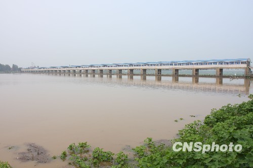 7月27日晚,湖北省防汛抗旱总指挥部紧急会商决定,鉴于目前汉江严峻的防汛形势,立即做好杜家台分洪区运用准备,要求武汉市、仙桃市“防指”做好人员转移、行洪清道、低矮圩堤的加固防守等工作。截至28日下午15时,杜家台闸前水位高达35.45米。湖北防汛会商会指出,要战胜汉江大洪水,必须做好严防死守和准备分洪的两手准备。图为杜家台分蓄洪闸。 中新社发 艾启平 摄