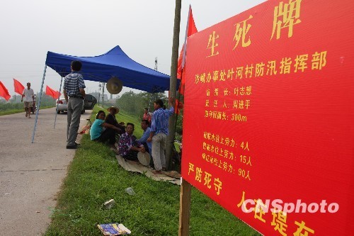 7月27日晚,湖北省防汛抗旱总指挥部紧急会商决定,鉴于目前汉江严峻的防汛形势,立即做好杜家台分洪区运用准备,要求武汉市、仙桃市“防指”做好人员转移、行洪清道、低矮圩堤的加固防守等工作。截至28日下午15时,杜家台闸前水位高达35.45米。湖北防汛会商会指出,要战胜汉江大洪水,必须做好严防死守和准备分洪的两手准备。图为杜家台分洪区的大堤上树起了“生死牌”。 中新社发 艾启平 摄