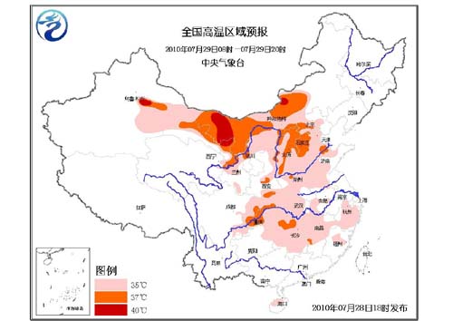 中央气象台发布的高温黄色预警称:明天(29日)白天,北京、天津、河北大部、山西、陕西关中地区和东部、宁夏中北部、河南大部、山东中西部、安徽北部、湖北、四川盆地东部、重庆、贵州东北部、湖南大部、江西中北部、浙江大部、福建北部、海南北部等地有35℃以上的高温天气,局地最高气温可达37~38℃;内蒙古中西部、甘肃大部、新疆吐鲁番盆地及南疆盆地东部等地将有35~37℃的高温天气,局地最高气温可达40℃以上。