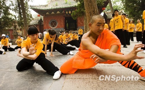 7月29日下午,河南登封,一群身着黄色功夫衫、黑色功夫裤和练功鞋的华裔青少年出现在少林景区,他们跟着少林武僧师傅们学起了少林功夫“五步拳”。当日,前来参加“2010年海外华裔青少年中国寻根之旅”河南功夫营的美国、加拿大、英国、爱尔兰、德国、瑞士、瑞典七个国家的50名海外华裔在少林寺拜师学艺感受中华功夫之魂。 中新社发 王中举 摄凡注有“cnsphoto”字样的图片版权均属中国新闻网,未经书面授权,不得转载使用。