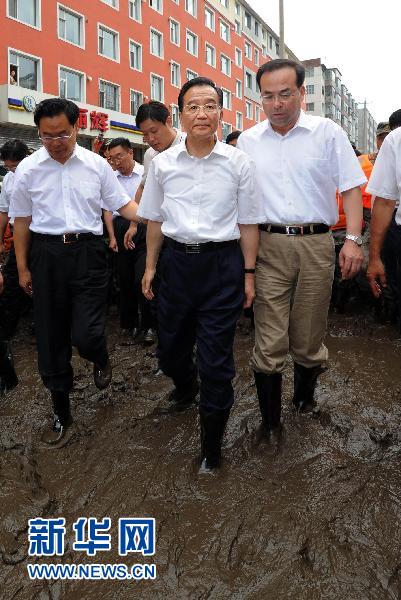 8月3日至4日,中共中央政治局常委、国务院总理温家宝在吉林省考察防汛抗洪工作。这是8月3日,在吉林市永吉县城,温家宝穿着胶鞋,踩着泥泞的道路察看灾情。新华社记者 李涛 摄