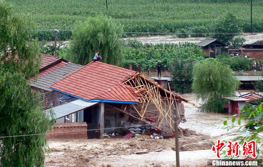 7月31日上午,暴雨山洪突袭吉林省通化县二密镇西岔村,村民张永艳在被洪水围困后,蹲守房顶5小时,终于在房子即将被冲毁时获救。图为当地村民拍下的张永艳蹲在房顶避难的情景,此时,她家的房子已经部分被毁。中新社发 钟新 摄