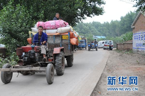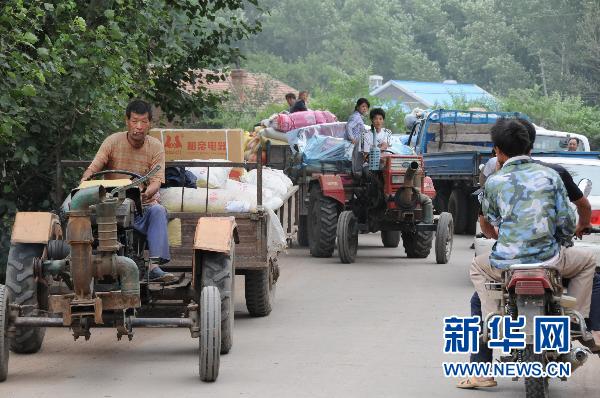 8月4日,第二松花江沿岸各村村民开着拖拉机,装载着家中的重要物品和粮食撤离家园。新华社记者马扬摄