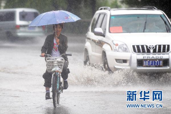 8月5日,一名市民在吉林市街头冒雨骑行。当日,吉林省吉林市再次遭遇强降雨。大到暴雨天气不仅给市民生活带来不便,也使防汛抗洪工作形势更加严峻。 新华社记者 徐家军 摄