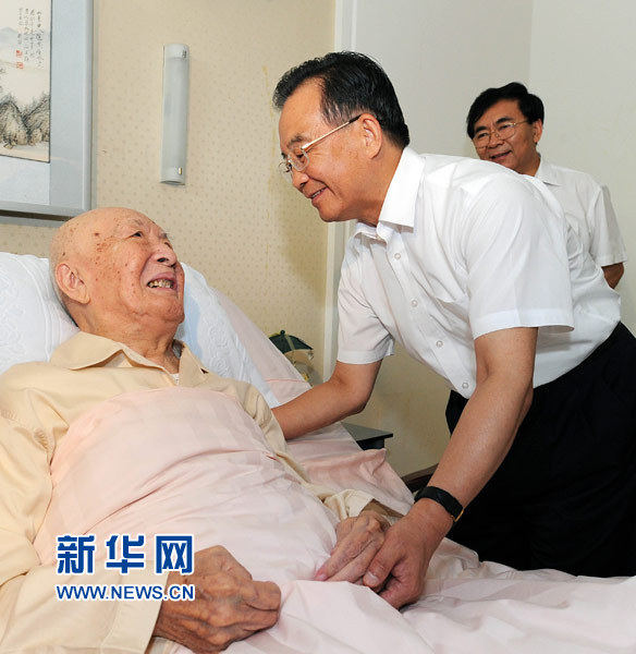 这是温家宝来到解放军总医院,看望在原子弹、氢弹研制中作出过突出贡献的“两弹一星”功勋奖章获得者、著名物理学家朱光亚。 新华社记者饶爱民 摄