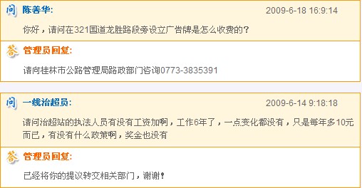 网友说的这个政府网站就是广西壮族自治区公路管理局网站,尤其是在留言咨询这个板块,网友问题和网站管理员的对话特别有意思。