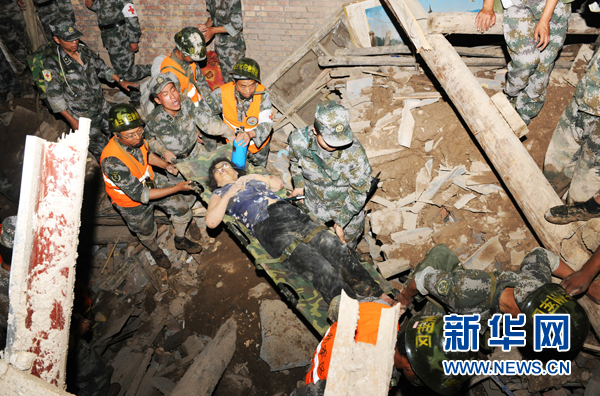 8月8日20时50分左右,兰州军区某防化团官兵救出一名幸存者。甘肃舟曲县特大山洪泥石流灾害发生后,兰州军区某防化团602名官兵经过6个多小时的急行军到达灾区,随即展开人员搜救,截至8日20时50分共救出9名幸存者。目前,官兵们仍连夜奋战在救援一线,争分夺秒进行生命大营救。新华社发 张永进 摄