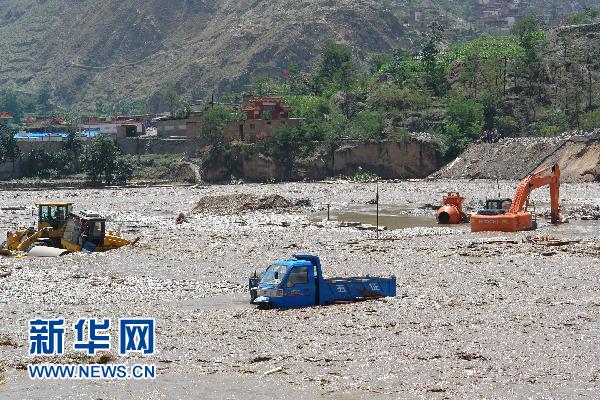 这是舟曲县被泥石流淹没的机械设备和车辆(8月8日摄)。 8月7日22时许,甘南藏族自治州舟曲县突降强降雨,县城北面的罗家峪、三眼峪泥石流下泄,由北向南冲向县城,造成沿河房屋被冲毁,泥石流阻断白龙江、形成堰塞湖。截至当日16时统计,泥石流灾害已造成127人死亡,76人受伤,近2000人失踪,紧急转移安置4.5万人,倒塌房屋120余户300余间。新华社发