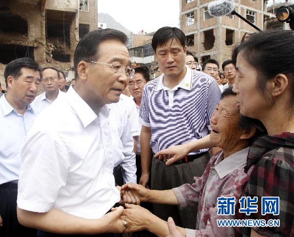 8月9日,中共中央政治局常委、国务院总理温家宝继续在甘肃舟曲县特大山洪泥石流灾区察看灾情,指导抗洪抢险救灾工作。这是温家宝在舟曲县灾区抚慰失去亲人的群众。新华社记者 李学仁 摄