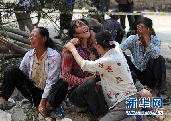 8月10日,几名失去亲人的受灾群众在废墟旁哭泣。截至当日14时,甘肃舟曲县特大泥石流灾害救援已经过去63小时,临近72小时“黄金救援期”。目前,解放军、武警和当地群众正全力投入搜救工作,争分夺秒地抢救生命。新华社记者 聂建江 摄