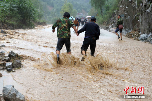 8月12日,甘肃省天水、陇南等地连遭暴雨袭击,316国道沿线大山坝、麻沿乡、筛子坝等多处通讯光缆被山洪冲断,公路40余处出现滑坡、泥石流,通信、交通、电力中断。目前,工程抢险队正加紧抢修。中新社发 陈文 摄