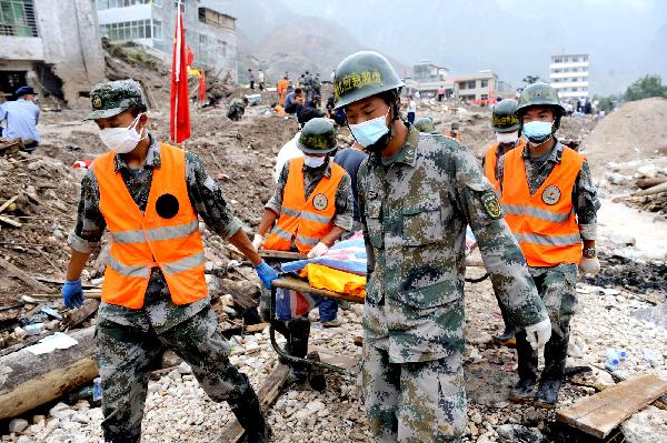 8月13日,救援人员将搜寻到的遇难者遗体抬离现场。根据最新统计数字,截至13日16时,甘肃省甘南藏族自治州舟曲县特大山洪泥石流灾害已造成1156人死亡、588人失踪。 新华社记者 陶明摄