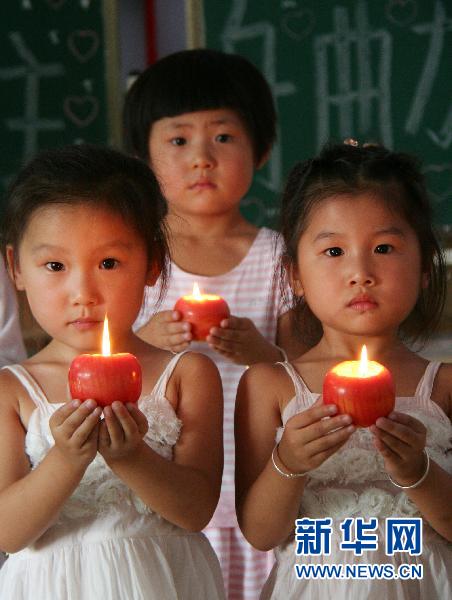 8月14日,山东郯城县新爱婴幼儿园的孩子们点燃蜡烛,为舟曲灾区祈福。新华社发(张春雷 摄)