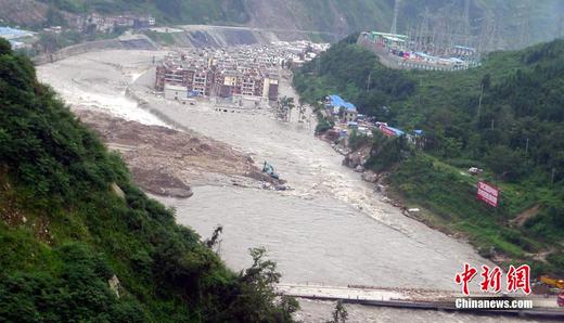 8月13日晚至14日凌晨,汶川县境内突降暴雨,导致映秀、漩口、银杏等多个乡镇发生滑坡、泥石流等灾情,交通、通信、电力、供水中断,岷江河段形成堰塞湖,将沿江的九寨沟环线、213国道淹没,道路中断。图为8月15日拍摄的被洪水围困的映秀新镇全貌。中新社发 李杰 摄