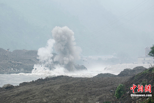 8月17日下午,映秀泥石流抢险救灾指挥部对致使岷江改道的堰塞体进行了第二次爆破
