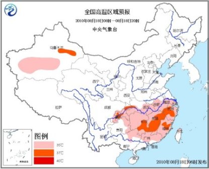预计,今天白天,四川盆地东南部、重庆大部、湖北南部和东部、安徽中南部、江苏南部、上海、浙江、江西、湖南、贵州东部、广西东北部、广东北部和东部、福建、台湾北部等地有35~37℃的高温天气,其中重庆西南部和东北部、湖南东南部、江西中部、浙江中西部等地的部分地区气温可达38℃。