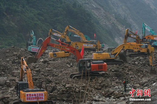 8月14日凌晨,汶川境内映秀镇、漩口镇、银杏乡、三江乡等乡镇发生多处泥石流灾害,据目前统计,泥石流已经造成41人失踪。泥石流阻断道路、冲毁房屋,泥石流冲出物致使120米宽的岷江河道淤塞,堰塞体平均高度达7米,致使岷江改道。图为由武警、路政、水利等部门调集挖掘机正在紧张作业,挖槽泄洪。中新社记者 张浪 摄
