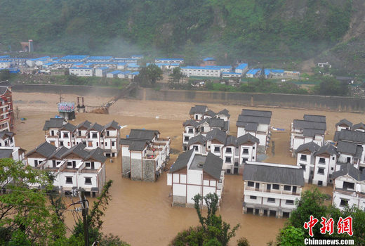 8月14日凌晨,连续强降雨引发汶川境内映秀镇、漩口镇、银杏乡、三江乡等乡镇发生多处泥石流灾害。图为映秀地震后重建房屋被洪水侵袭 。中新社发 汶川新闻中心 供图