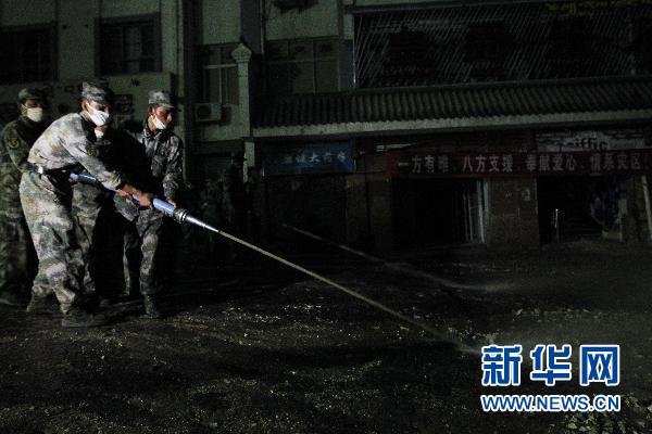8月17日晚,兰州军区某部官兵在甘肃舟曲县城清洗街道。连日来,担任甘肃舟曲县城清淤和堰塞湖排险任务的解放军和武警部队官兵夜晚不休,奋战在灾区一线,争取早日帮助灾区恢复生活和生产秩序。新华社记者 任正来 摄