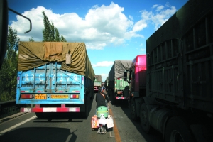 昨日,京藏高速东洋河收费站附近,当地人游走在车辆中间贩卖商品。京藏高速大堵车昨日进入第9天,拥堵情况有所缓解,以前最拥堵的内蒙古兴和至河北东洋河段,车辆经过时间由3天缩减至1天。记者发现,拥堵车辆大多为煤车,煤车司机称如绕行需要经过煤检站,可能要交罚款,还要多交高速费,所以宁堵不绕行。 王申 摄