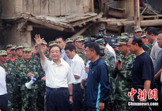 8月22日上午,中国国务院总理温家宝第二次来到甘肃舟曲灾区,看望舟曲特大泥石流灾害中受灾的群众。中新社发 庞红升 摄