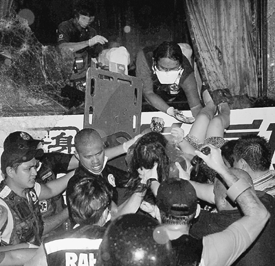 8月23日,在菲律宾首都马尼拉,医护人员将劫持事件中受伤的人员抬下客车。新华社发