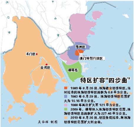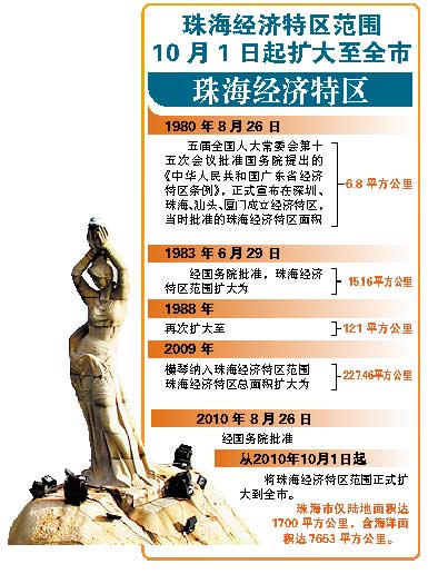 1980年8月,在珠海设立经济特区,面积仅6.8平方公里,特区面积先后经过1983年、1988年两次扩大后,2009年横琴岛纳入珠海经济特区范围,至今珠海经济特区总面积扩大为227.46平方公里,占全市陆域面积的12%。昨晚,珠海市委常委、宣传部长黄晓东在新闻发布会上表示,经国务院批准,珠海经济特区范围再次扩大到全市,据了解,珠海市仅陆地面积达1700平方公里,含海洋面积达7653平方公里。