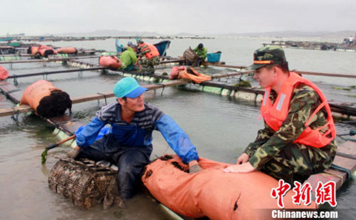 8月31日,福建边防派出所官兵深入码头、渔排、台轮停泊点,帮助辖区渔船民和来靠台胞加固船只及渔排,以应对当前海面上“狮子山”、“圆规”和“南川”三个热带风暴的夹击。中新社发 黄煜情 摄