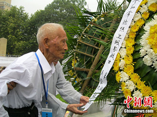 9月3日上午,来自海峡两岸的各界人士和当年浴血战场的老兵代表,来到湖南常德会战阵亡将士纪念碑塔前,纪念抗战胜利65周年暨公祭67年前常德会战中英勇献身的民族英烈。图为曾参加过常德会战的老兵向逝去的战友敬献花圈。中新社发 刘柱 摄