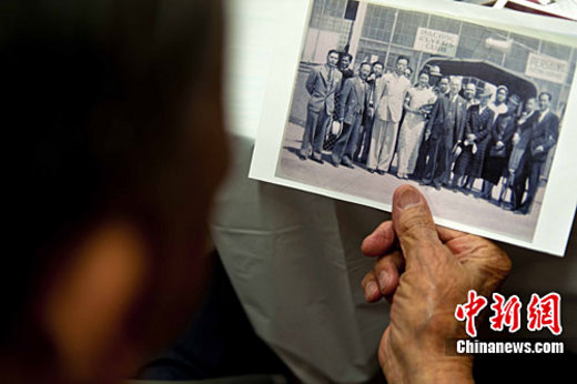 当地时间9月2日晚间,中国驻旧金山总领事馆举行庆祝抗日战争胜利65周年活动。96岁的前美国飞虎队成员、华裔张松仰展示当年在旧金山东湾阿拉米达空军基地受训时的照片。张松仰表示,训练费用和飞机都是由当地华侨捐助提供。中新社发 陈钢 摄