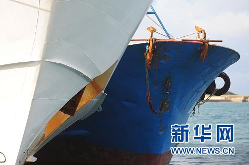 这张9月9日拍摄的照片显示,在冲绳县石垣港,被日本海上保安厅扣留,停靠在“与那国”号巡逻船旁的中国渔船(右)。新华社记者 季春鹏 摄