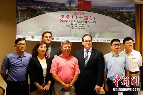 为庆祝中华人民共和国成立61周年,美国环太平洋商会、南加州华人联合总会等团体将于10月3日联合举办“全球华人高尔夫球会杯锦标赛”。美国环太平洋商会会长江启光(左一)9月11日在记者会上称,届时将有来自中国大陆、海外和美国的数百名选手参赛。张炜 摄