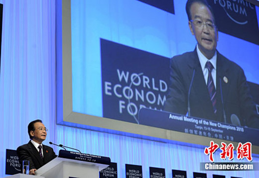 9月13日,世界经济论坛2010年新领军者年会(简称“夏季达沃斯论坛”)开幕,国务院总理温家宝出席开幕式并致辞。中新社记者 刘震 摄