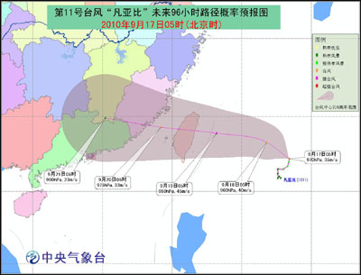 预计,“凡亚比”中心将以每小时10公里左右的速度向西偏北方向移动,逐渐向中国台湾东部一带沿海靠近,强度继续加强,将于19日白天在这一带沿海登陆。