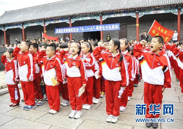 9月17日,长春市西五小学的同学们庄严宣誓。当日,来自吉林省公安厅警卫局的战士以及长春市妇女儿童活动中心的农民工子女、长春市西五小学、长春市103中学等学校的学生共1000余人,来到伪满皇宫博物院熙缉楼“九·一八”纪念碑前,庄严宣誓:“不忘‘九·一八’血雨腥风,弘扬先烈爱国之情,缅怀英烈报国之志,恪守革命遗志!” 新华社记者 肖潇 摄