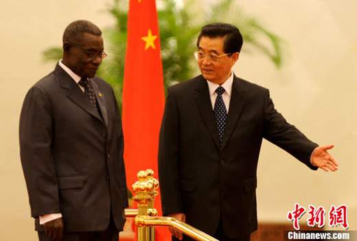 9月20日,中国国家主席胡锦涛在北京人民大会堂举行仪式欢迎加纳共和国总统约翰·埃文斯·阿塔·米尔斯访华。中新社发 廖攀 摄