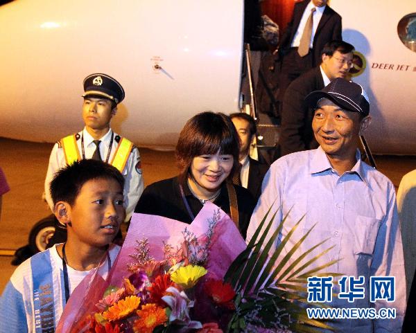 9月25日,詹其雄(前右)与前来迎接的妻儿团聚。当日4时,被日方非法抓扣的中国渔船船长詹其雄乘中国政府包机安全返抵福州。新华社记者姜克红摄
