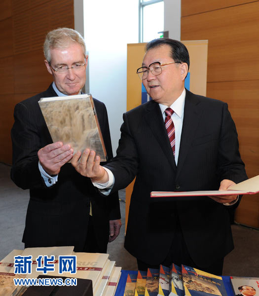 9月26日,正在爱尔兰进行正式友好访问的中共中央政治局常委李长春向都柏林孔子学院赠送孔子铜像和书籍。这是李长春(右)向都柏林大学校长布雷迪赠送中国图书。 新华社记者 马占成 摄