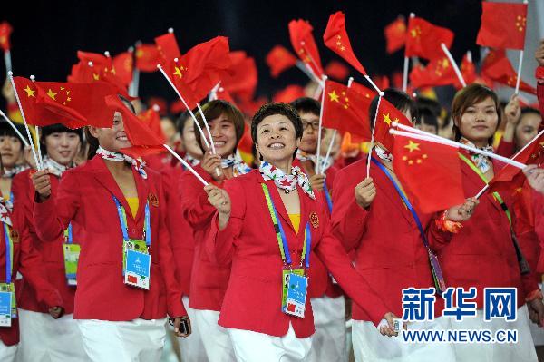 东道主中国代表团最后入场,担任旗手的是北京奥运会女子赛艇冠军金紫薇。中国体育代表团由1454人组成,其中参赛选手977人,创中国历届亚运会参赛人数之最,也是本届亚运会参赛运动员最多的代表团。