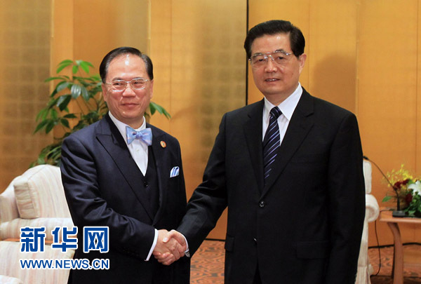胡锦涛会见曾荫权 11月13日,国家主席胡锦涛在日本横滨会见香港特别行政区行政长官曾荫权。新华社记者樊如钧摄