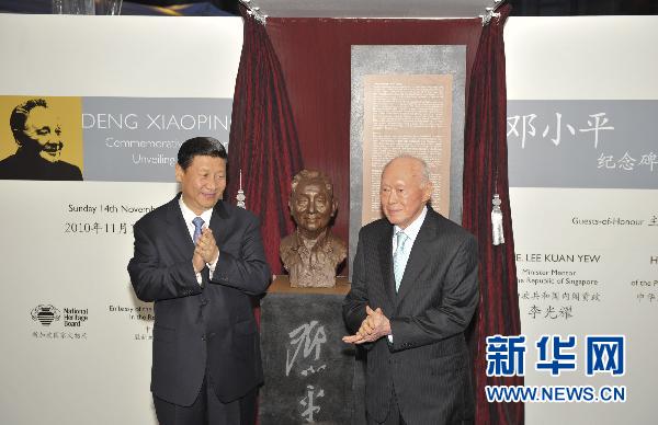 11月14日,正在新加坡访问的国家副主席习近平与新加坡内阁资政李光耀共同出席在新加坡河畔举行的邓小平纪念碑揭幕仪式。新华社记者黄敬文摄
