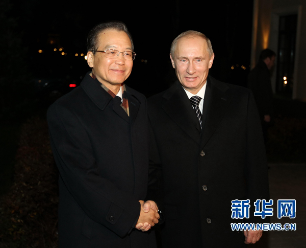11月22日,国务院总理温家宝在圣彼得堡与俄罗斯总理普京举行小范围会谈并出席普京举行的欢迎宴会。新华社记者鞠鹏摄