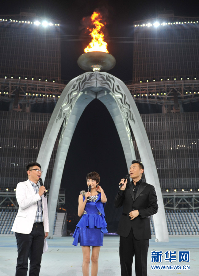 11月27日,第16届亚运会将在广州海心沙岛举行闭幕式。这是主持人在闭幕式前调动观众热情。 新华社记者公磊摄