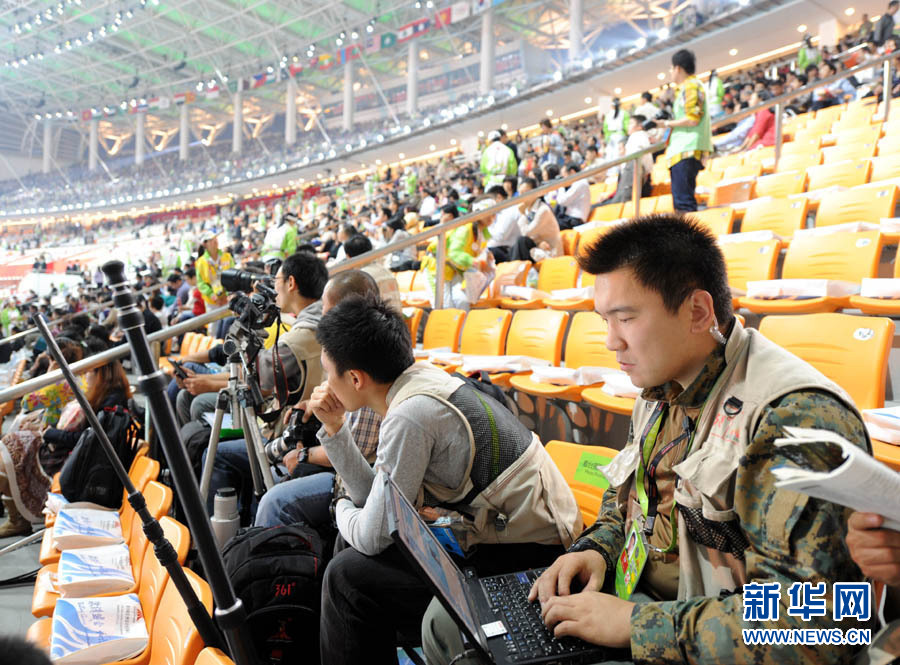 11月27日,记者们在看台上工作,等待闭幕式开始。第16届亚运会闭幕式将在广州市海心沙岛举行。 新华社记者李勇摄