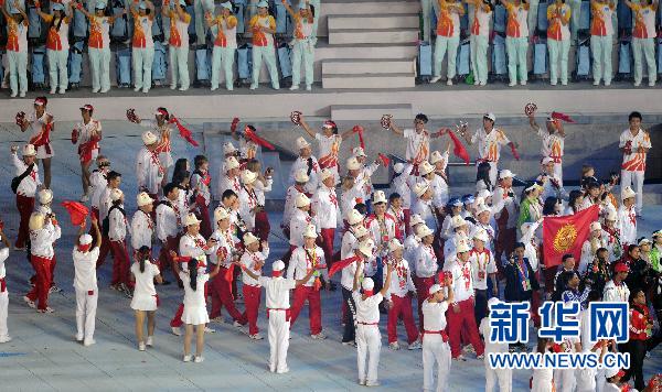 各代表团在闭幕式上入场 11月27日,吉尔吉斯斯坦代表团在闭幕式上入场。当日,第16届亚运会闭幕式在广州市海心沙岛举行。 新华社记者杨磊摄