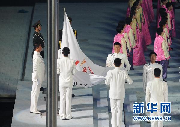 11月27日,亚奥理事会会旗在闭幕式上缓缓降落。当日,第16届亚运会闭幕式在广州市海心沙岛举行。 新华社记者李勇摄